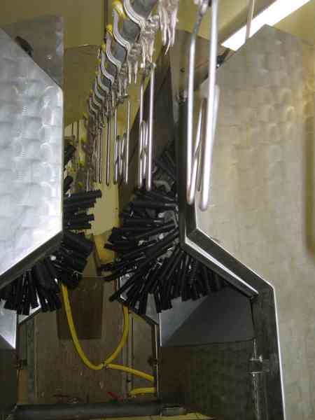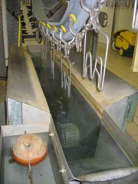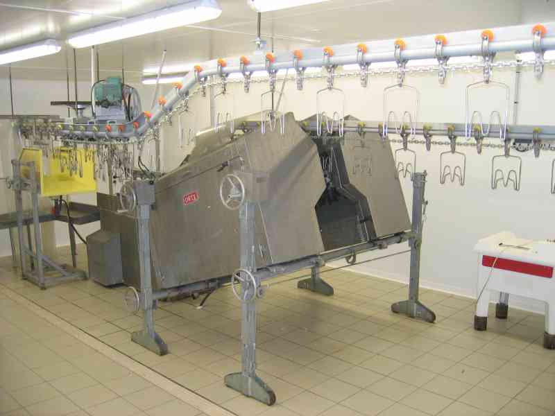 Les volailles passent dans un bac trempeur ou l'eau est à 51°C, puis traversent la plumeuse.